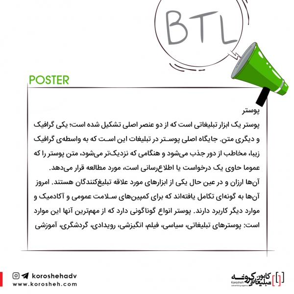 پوستر یک ابزار تبلیغاتی است که از دو عنصر اصلی تشکیل شده است؛ یکی گرافیک و دیگری متن. جایگاه اصلی